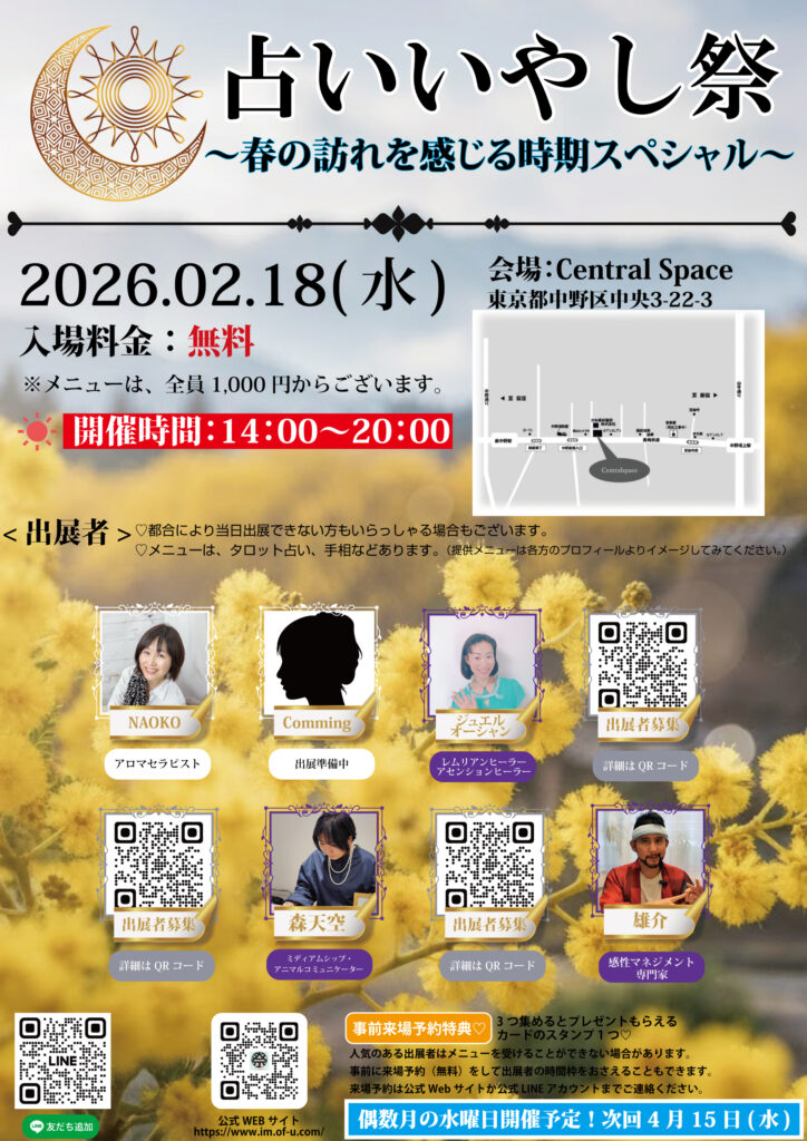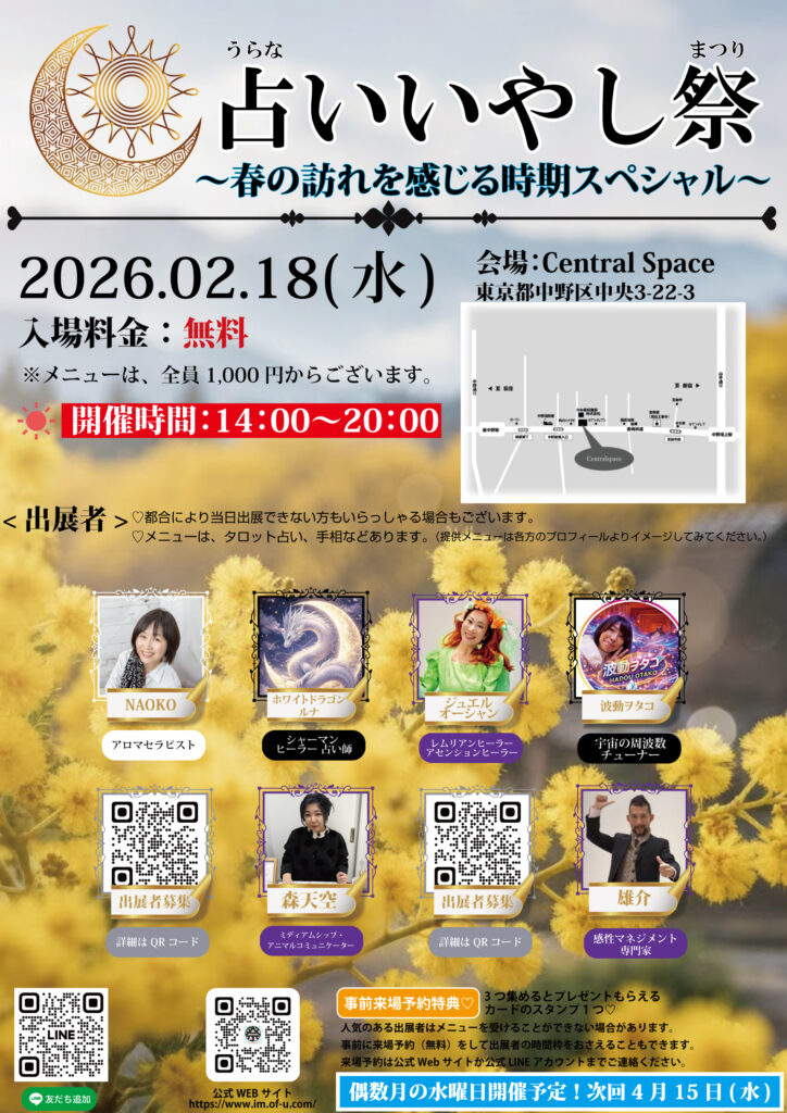- 2025.10.03「占いいやし祭り」2026年の年間スケジュールが確定しました。出展者募集中。詳しくはこちら
