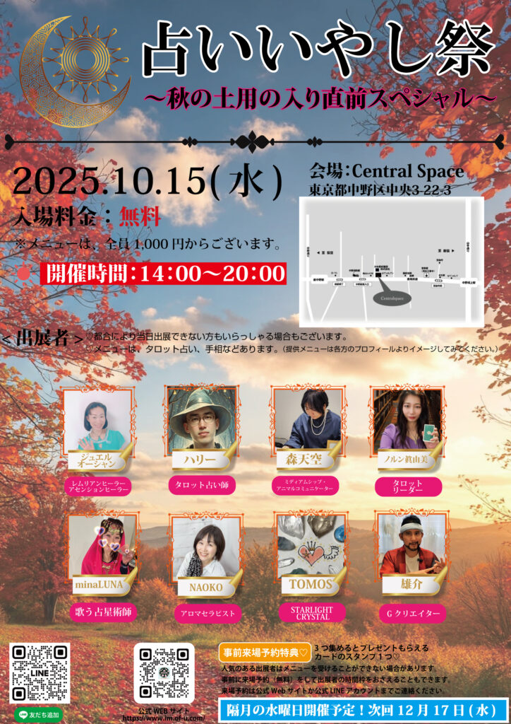 つい先日の2025.10.15(水)に「占いいやし祭」を開催させていただきました。