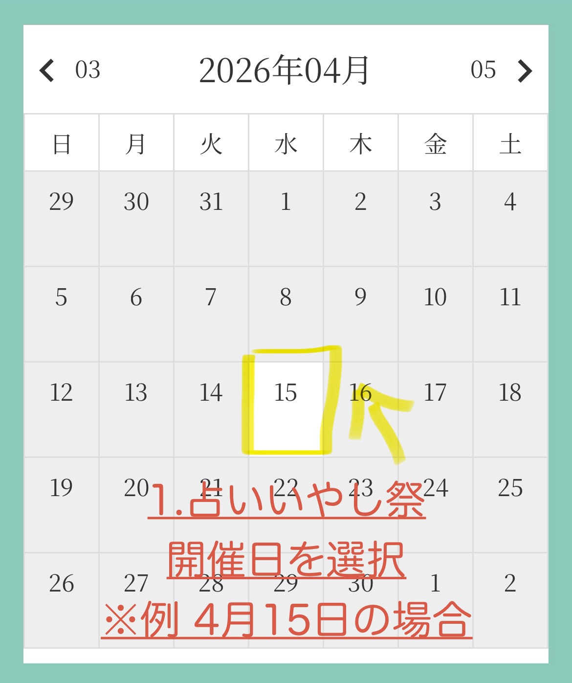 以下のカレンダーより開催日時を選択して枠の事前予約をお願いします。