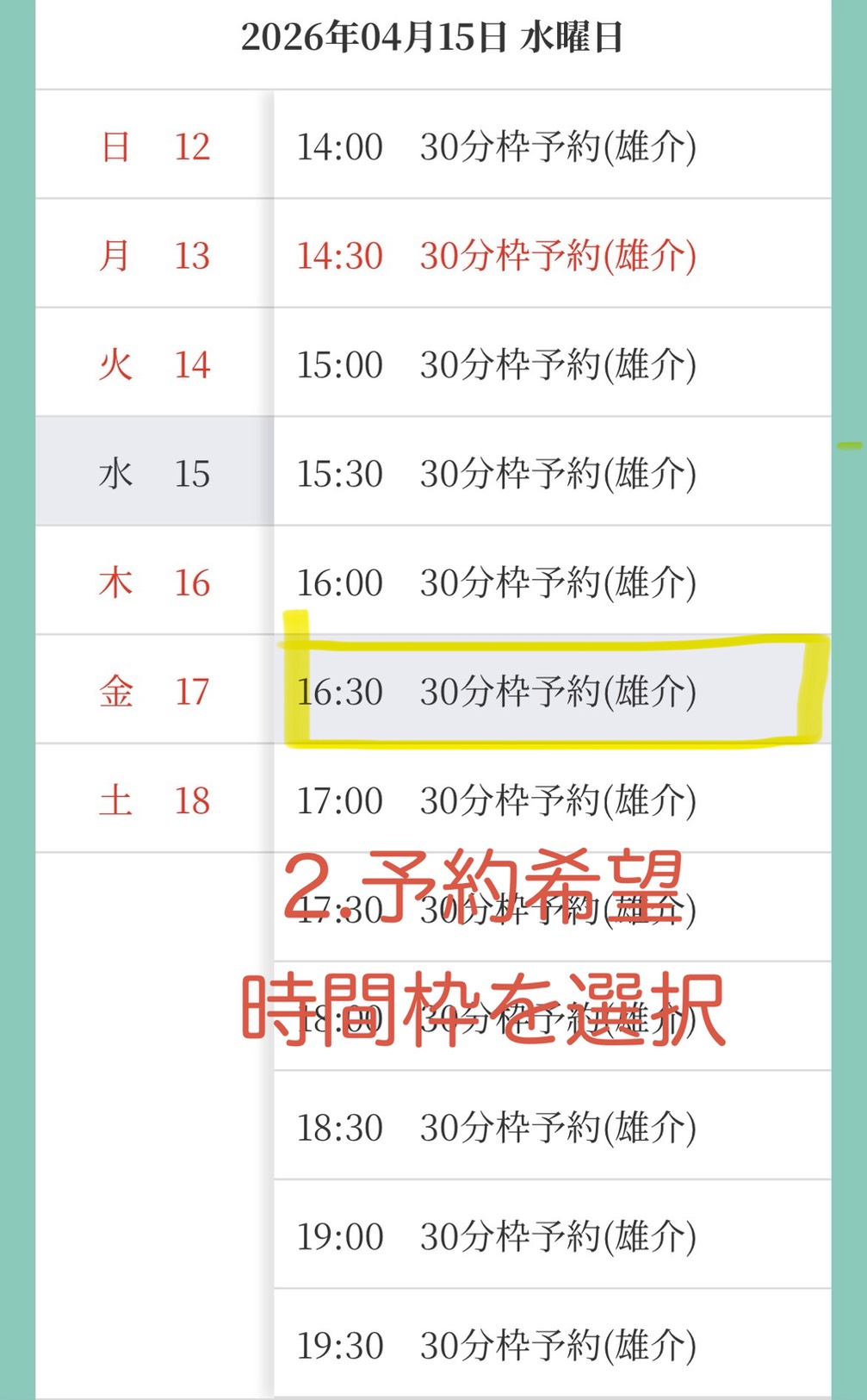 ※40分のメニューなど30分以上のメニューをご希望の場合にはお手数ですが枠を2枠ご予約してください